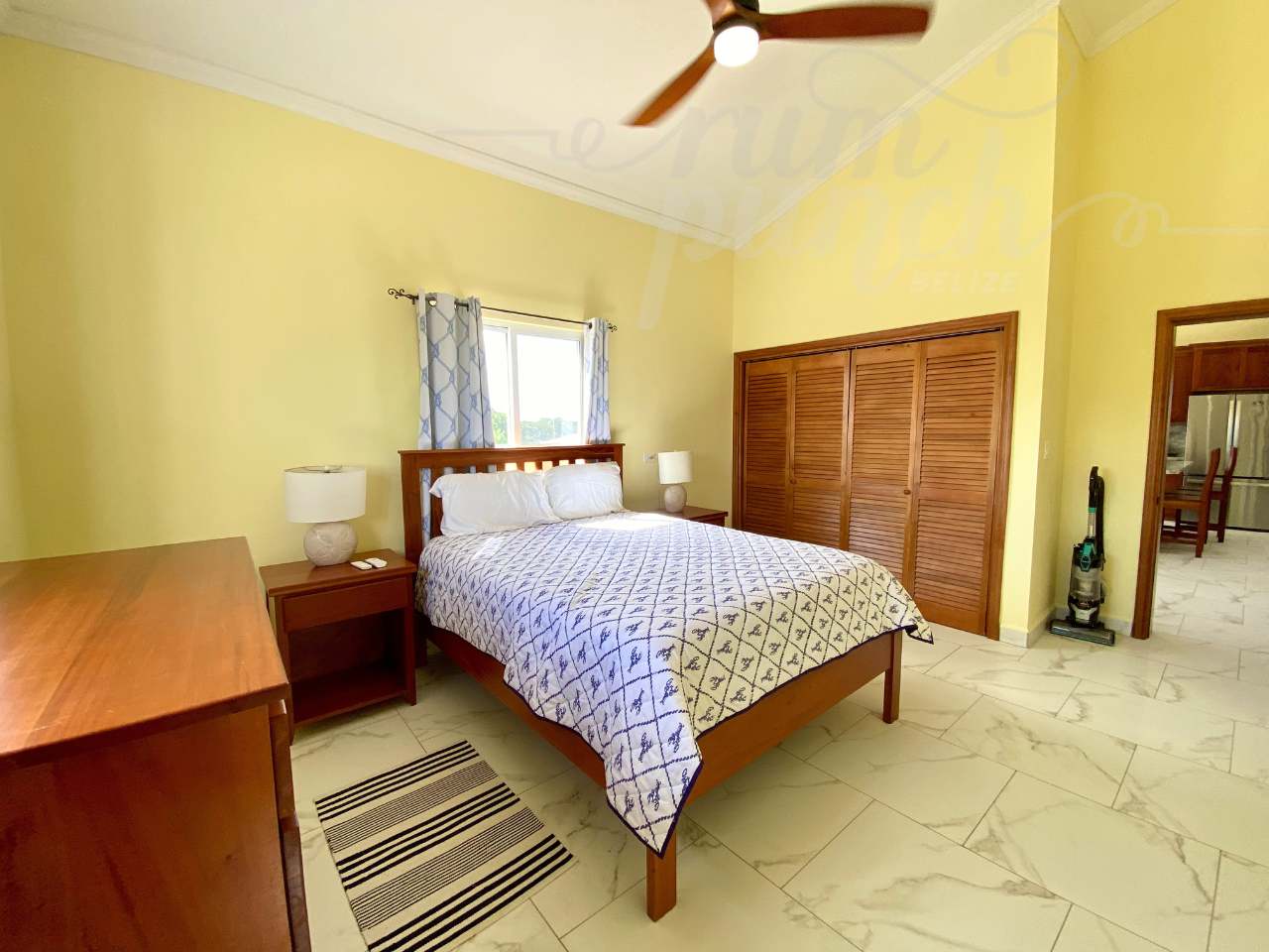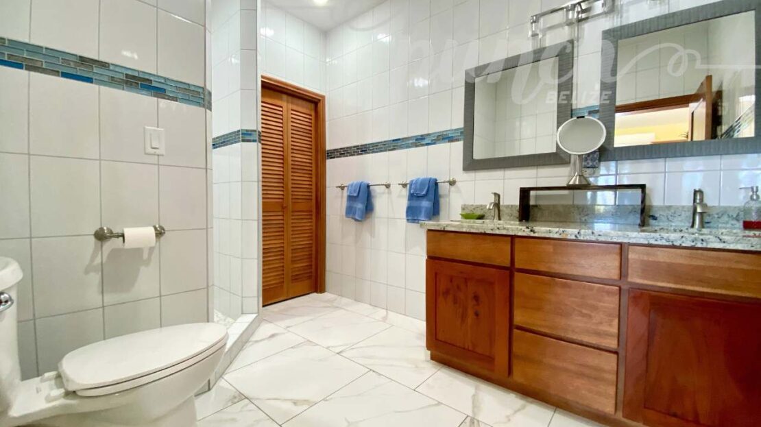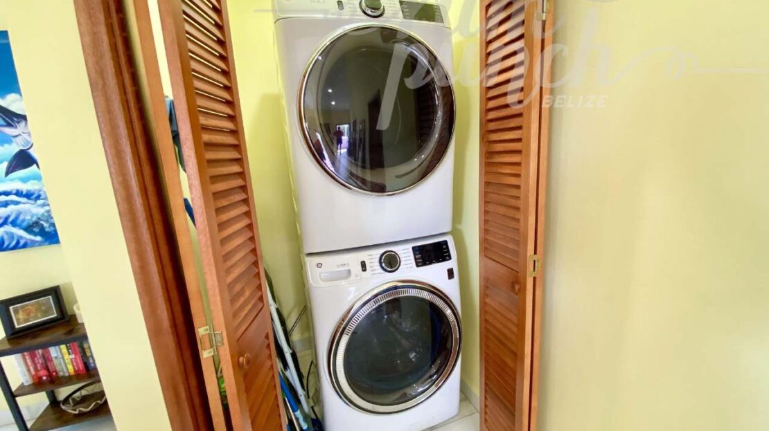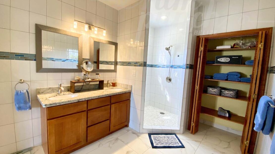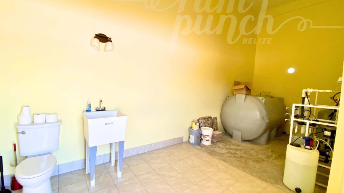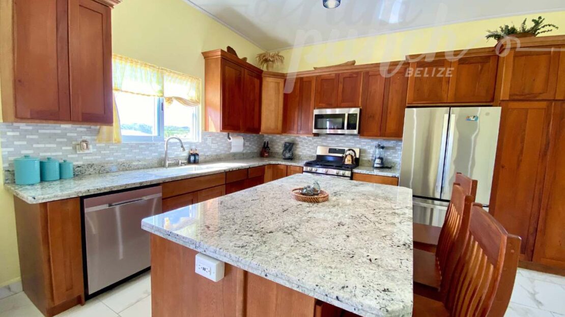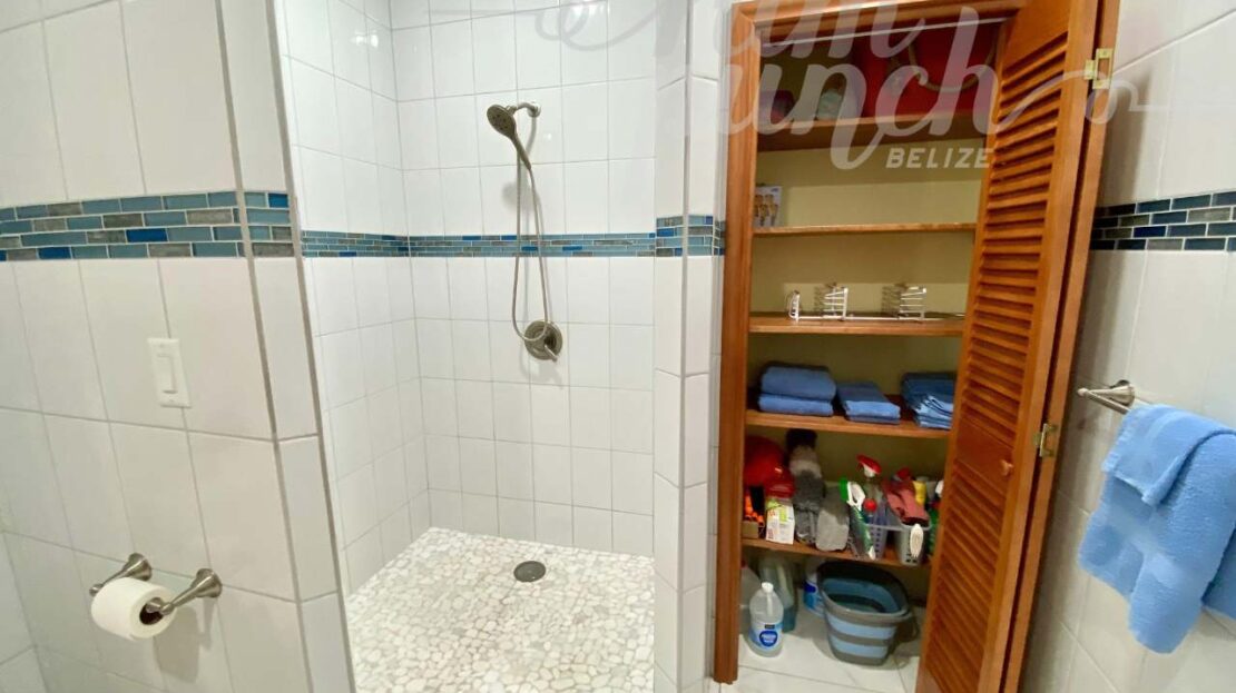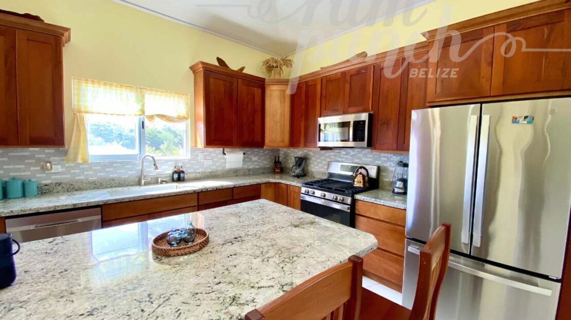 The interior craftsmanship reflects the best of Belizean artistry. All woodwork throughout the home is custom hardwood, handcrafted by local artisans in Belize, giving the property a warm and authentic character. The kitchen and storage areas feature premium pull-out shelving and custom cabinetry, designed for both beauty and convenience.