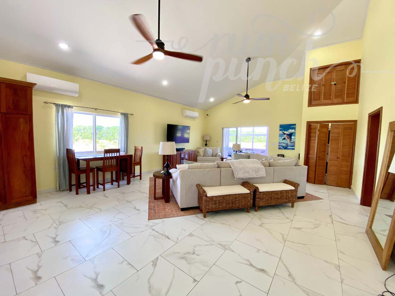 Inside, the home features a large open-concept floor plan ideal for entertaining, with excellent airflow and natural light throughout. Every room includes split air-conditioning units, though the steady coastal breeze often makes them unnecessary.